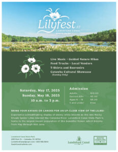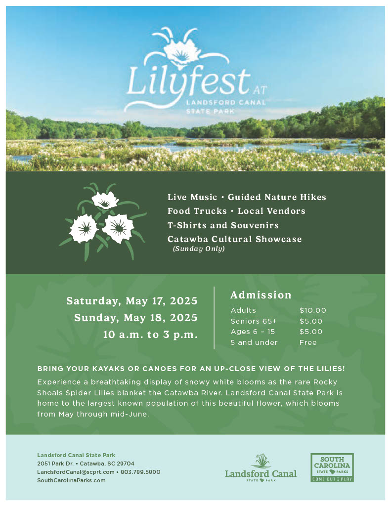 Lilyfest returns to Landsford Canal State Park, celebrating the peak bloom of rare rocky shoals spider lilies. Experience these breathtaking flowers during their short, predictable window of bloom. Enjoy a leisurely stroll (3/4 mile one way) along the historic Canal Trail or Nature Trail to the lily viewing platform, where the world’s largest population of spider lilies creates a stunning display across the Catawba River.